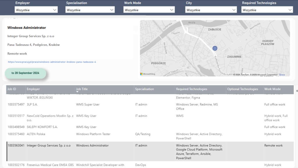 For each job URL, detailed information is extracted, such as job title, employer name, location, technologies, and publication date. The data is structured into a dictionary and saved to a CSV file for analysis.